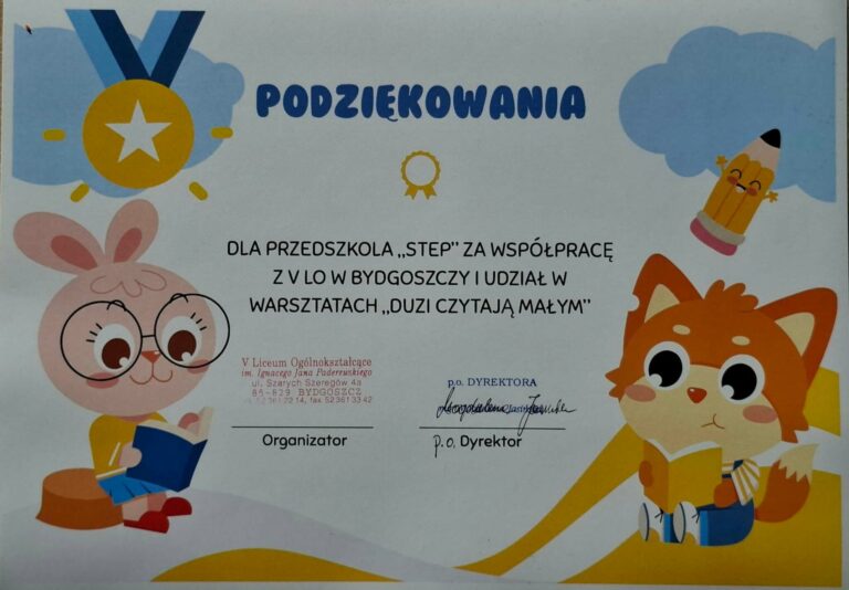 Z życia przedszkola Starszaki na warsztatach w liceum Dziennikarz Stepek 20 marca 2026 Previous Next Najnowsze wpisy Jeżyki „Z” jak zegar, „Z” jak zawody zespołowe i teatralna niespodzianka Jeżyki Obserwacje przyrodnicze z wykorzystaniem „Zestawu badacza” w ramach realizacji projektu edukacyjnego „Waga środowiska” Jeżyki Wycieczka 5 i 6 latków na warsztaty do Apteki pod Łabędziem